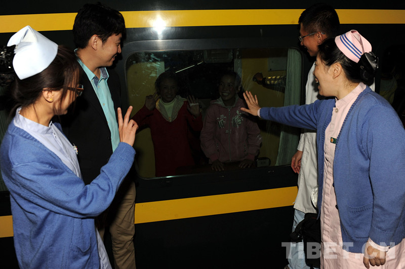 這是北京兒童醫(yī)院醫(yī)生在北京西站為術(shù)后乘火車返藏的先心病患兒送行告別(唐召明2012年9月28日攝)