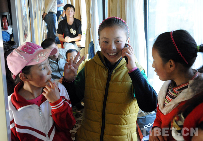 這是乘火車進(jìn)京治療先心病的患兒卓嘎,在火車將抵達(dá)北京時,給阿爸打電話報平安(唐召明2012年9月18日攝)