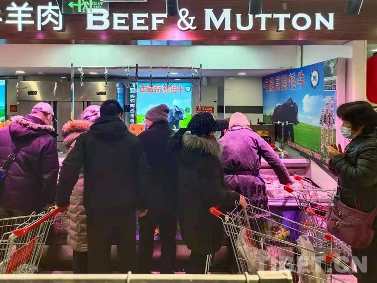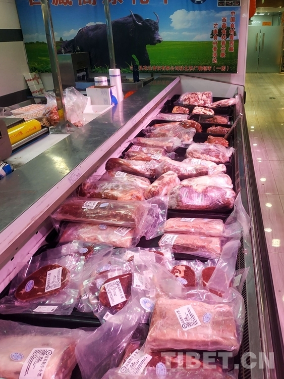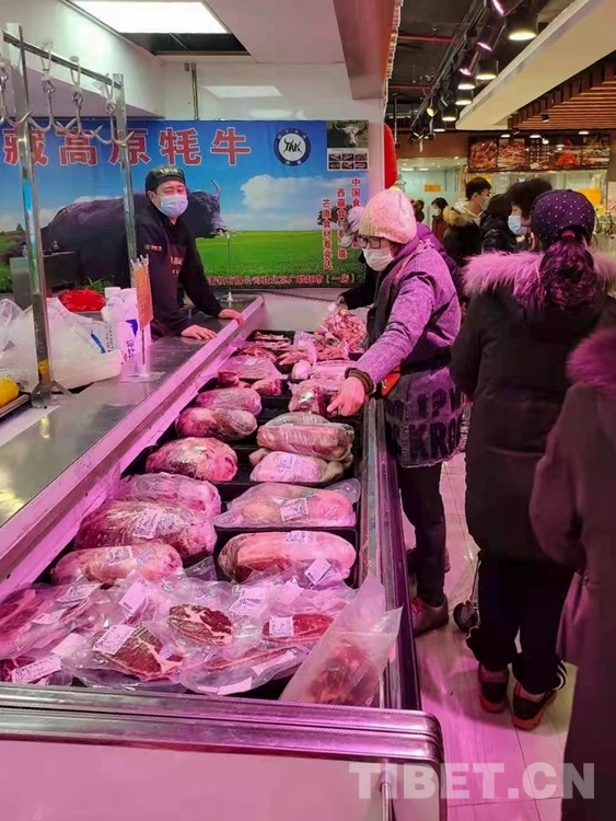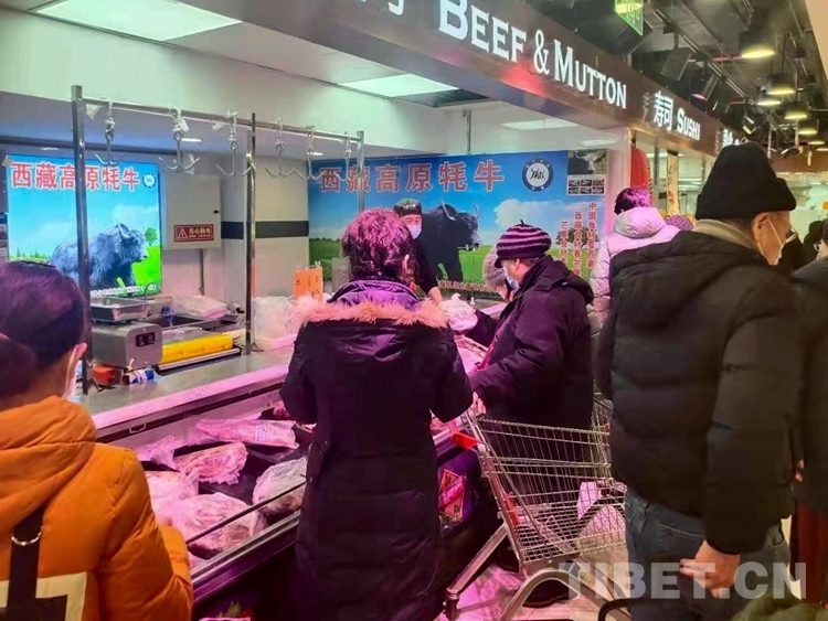 中國西藏網訊 近日,北京廣聯連鎖超市冷鮮肉柜臺前,購買牛肉的市民正在認真選購來自西藏昌都市芒康縣的高原牦牛肉。