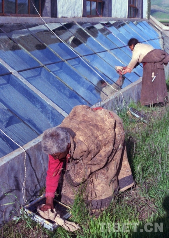 圖為藏北那曲縣(現(xiàn)改為色尼區(qū))建成的集太陽能采暖、硅光照明、太陽灶做飯的養(yǎng)老院。圖為五保戶老人正在擦拭采暖房玻璃和硅光電池板 唐召明1988年攝