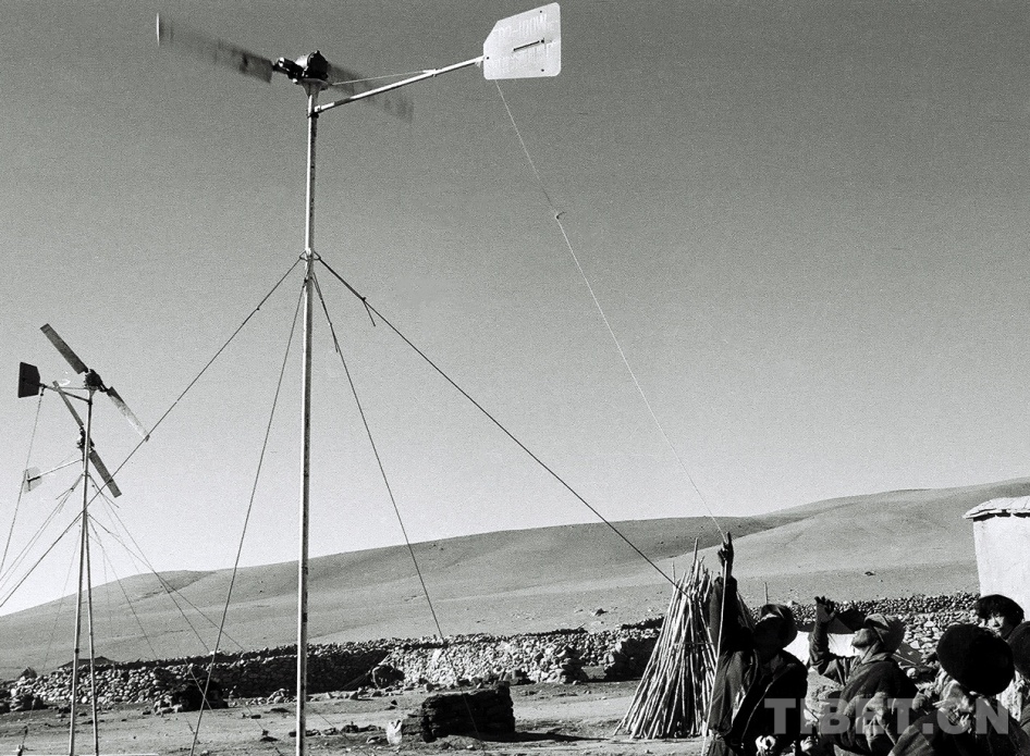 圖為那曲風能實驗站技術人員為雙湖辦事處(現(xiàn)改為雙湖縣)嘎措鄉(xiāng)牧民檢修保養(yǎng)所安裝的風力發(fā)電機 唐召明1988年攝