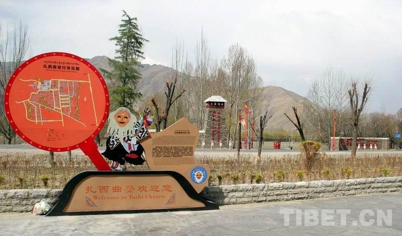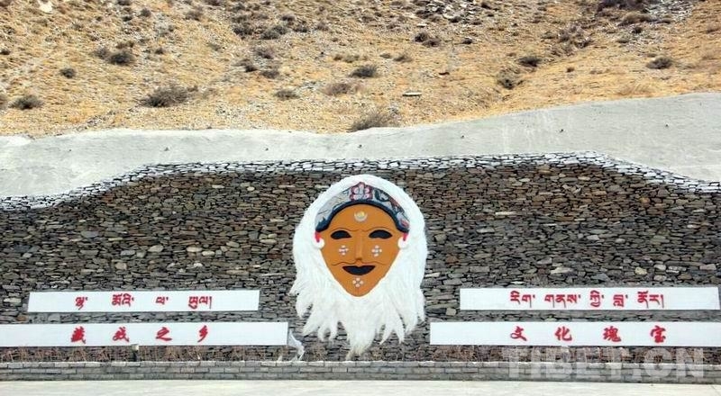 圖為扎西曲登社區(qū)引以為豪的“藏戲第一村”標(biāo)志 攝影:劉莉