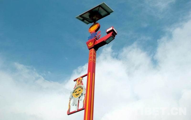 圖為扎西曲登社區(qū)中的路燈也裝扮上了特色濃郁的扎西雪巴藏戲黃面具 攝影:劉莉