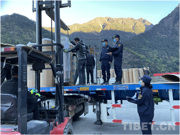 圖為聶拉木海關(guān)關(guān)員正在對援尼物資進(jìn)行現(xiàn)場監(jiān)管