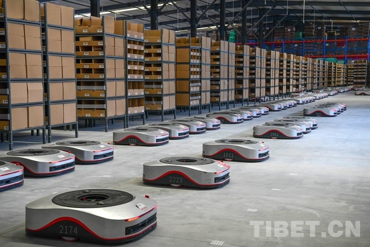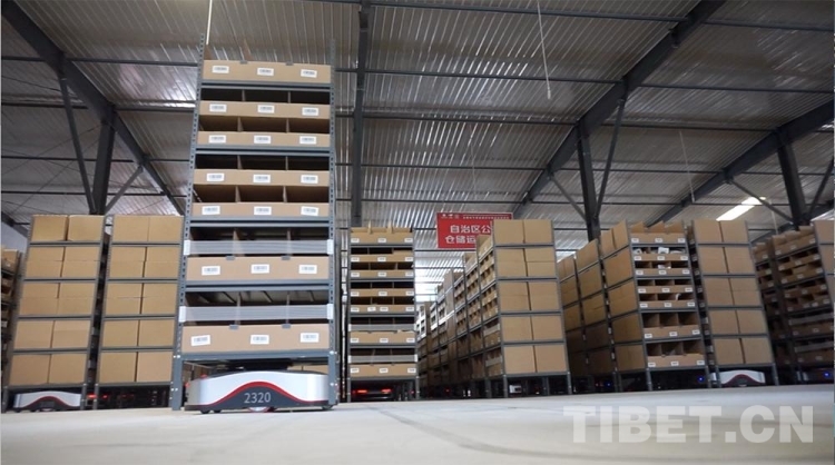 圖為西藏自治區(qū)級公共物流倉儲配送中心里,搬運型機(jī)器人“地狼”投用