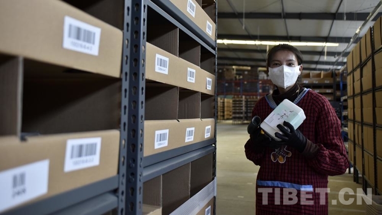 圖為西藏自治區(qū)級公共物流倉儲配送中心里,作業(yè)人員將搬運型機(jī)器人“地狼”載來的貨架上的貨物取出