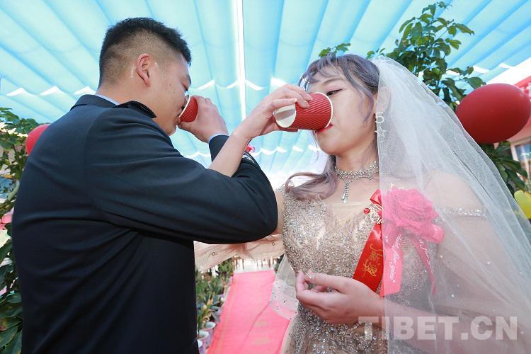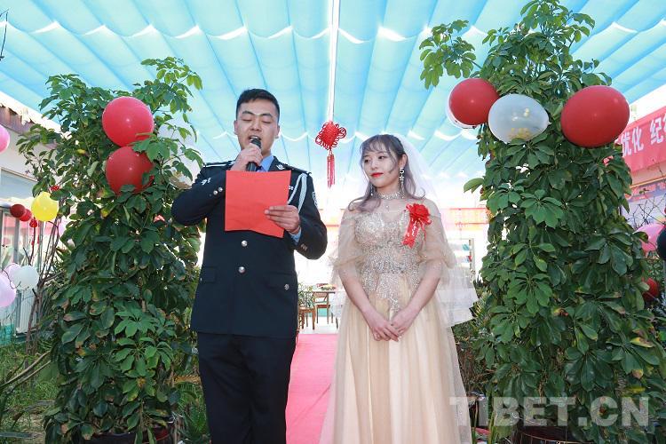 沒有鋪張豪華的迎親車隊,沒有山珍海味的結(jié)婚宴席,大家在陽關(guān)房里鋪上紅地毯、掛上彩色氣球,用鮮花和彩帶巧手裝點禮堂。繽紛的喜字掛在墻上,讓平日里莊嚴肅穆的營區(qū)變成了另一番景象,讓新娘感受到了只有警嫂才有的至高禮遇。藏青藍與婚紗白交融,浪漫與忠誠在海拔4300米演繹著動人的交響曲。