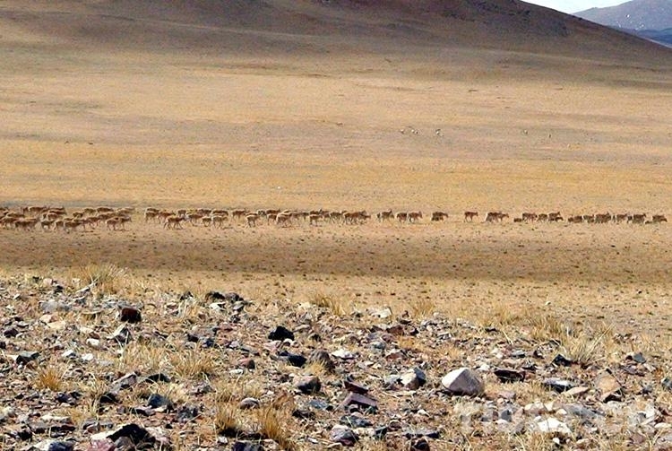 這是在羌塘國(guó)家級(jí)自然保護(hù)區(qū)核心地帶正在遷徙的成群雌性藏羚羊(唐召明2006年攝)