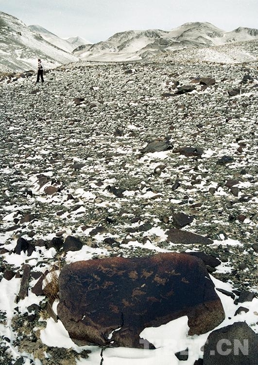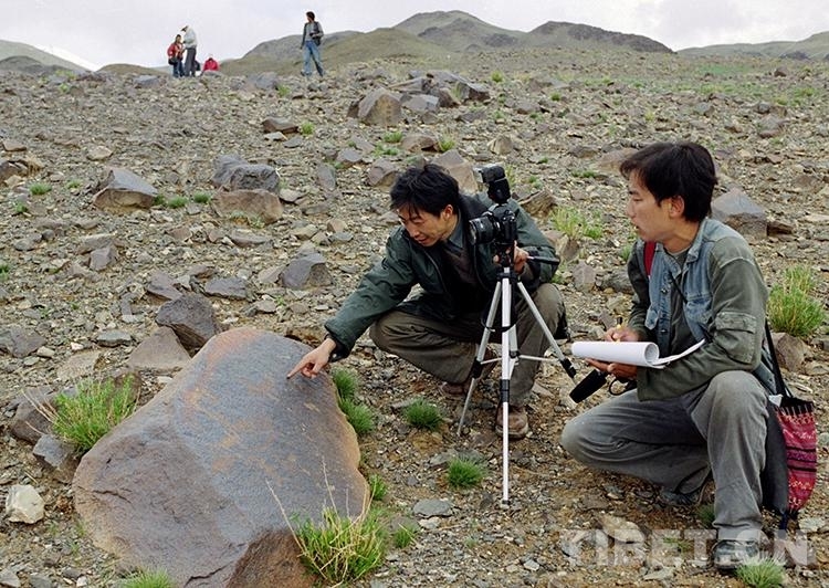 這是藏北無人區(qū)科考團(tuán)科考人員在對(duì)尼瑪縣榮瑪鄉(xiāng)加林山巖畫進(jìn)行科學(xué)考察(唐召明2001年攝)