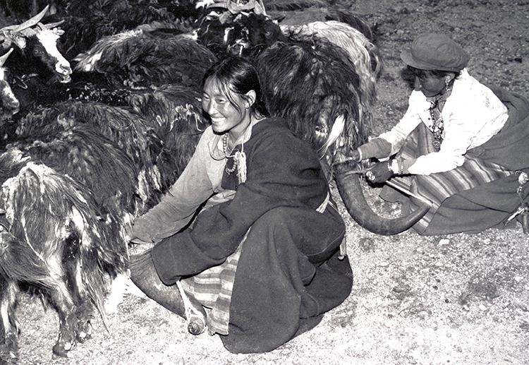 這是在雙湖辦事處北措折鄉(xiāng)(現(xiàn)雙湖縣措折強(qiáng)瑪鄉(xiāng))牧女正在使用牦牛角當(dāng)器皿擠羊奶(唐召明1989年攝)