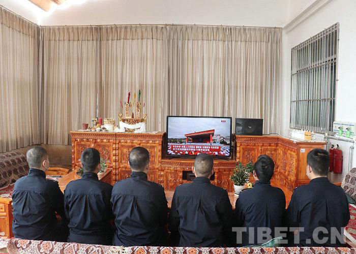 圖為西藏出入境邊防檢查總站執(zhí)法調(diào)查支隊(duì)廣大民警收聽收看慶祝西藏和平解放70周年大慶直播盛況