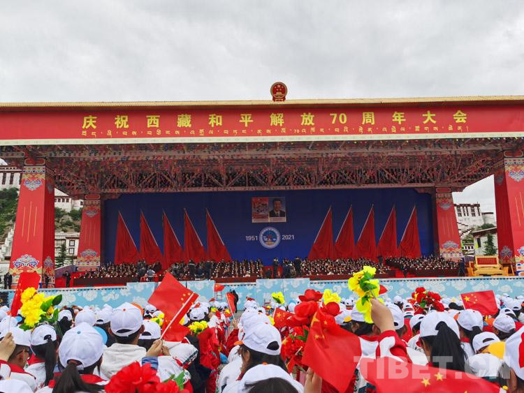 古城拉薩彩旗招展、花團(tuán)錦簇,處處洋溢著歡樂喜慶的節(jié)日氛圍。雄偉的布達(dá)拉宮下,搭建起藏式風(fēng)格的大會(huì)主席臺(tái)。主席臺(tái)上方,莊嚴(yán)的國徽和“慶祝西藏和平解放70周年大會(huì)”橫幅分外醒目,背景墻上懸掛著大慶會(huì)徽和“1951”“2021”字樣,10面紅旗分列兩側(cè)。主席臺(tái)對(duì)面的布達(dá)拉宮廣場(chǎng)上,身著節(jié)日盛裝的各族群眾從四面八方早早匯聚到這里,揮舞著手中的國旗、花束,匯聚成一片歡樂的海洋。