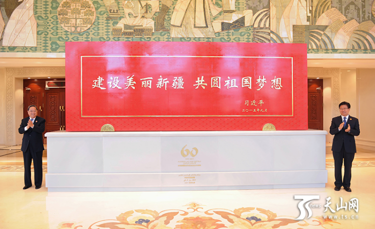 2015年9月25日,時任中共中央政治局常委、全國政協(xié)主席、中央代表團團長俞正聲和時任中共中央政治局委員、自治區(qū)黨委書記張春賢一同為習近平總書記題詞賀匾揭幕。攝影:新疆日報記者盧民一