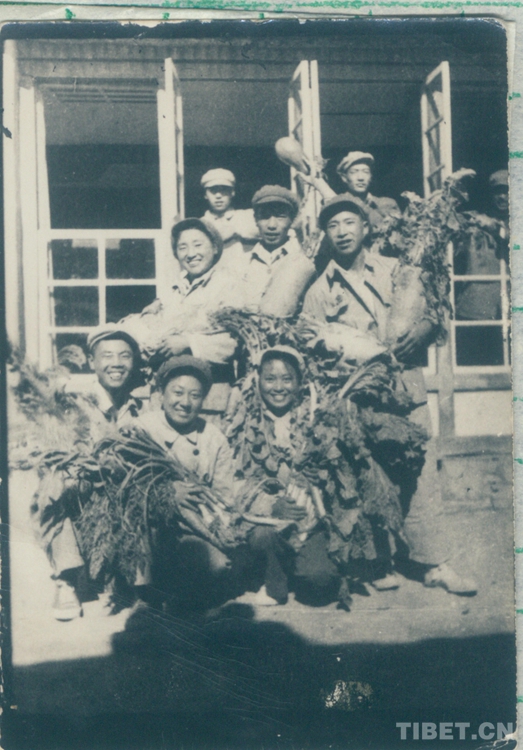 入城后,文工隊分別住在江孜城郊強查洞幾處民房里。初到江孜,后方給養(yǎng)一時運不上來,蔬菜等主副食又得不到有效供給,西藏只有土豆、元根,他們還不能隨便采購。西藏工委和十八軍黨委遵照毛主席“進軍西藏,不吃地方”的指示,提出“搞好生產(chǎn)是進藏部隊長期的一項中心任務(wù)”,文工隊同分工委全體工作人員一道在帕拉開墾荒地、播種糧食。天寒地凍又缺少農(nóng)具,用鐵锨鏟鏟不動,用十字鎬挖,一鎬下去,直冒火星。同志們想方設(shè)法烤凍土,翻起一塊一塊像鐵板一樣的凍土,晾在太陽下曬,然后再一鎬一鎬的砸碎、耙平,沒有耕牛,男同志就扛起繩拉犁,女同志平地耙地。江孜海拔4000米以上,平日里都缺氧,此時再加上勞累更是頭暈?zāi)X脹,上氣不接下氣,可是他們充分發(fā)揚“不怕苦不怕累”的精神,終于開出一片荒地、撒下種子、收獲了自己種下的糧食,做到了一部分自給,在西藏群眾中產(chǎn)生了很好的影響。文工隊還在住地附近開辟了一塊地種菜,用實際行動徹底粉碎了西藏上層反動集團妄圖用糧食困住解放軍進而餓走解放軍的美夢。