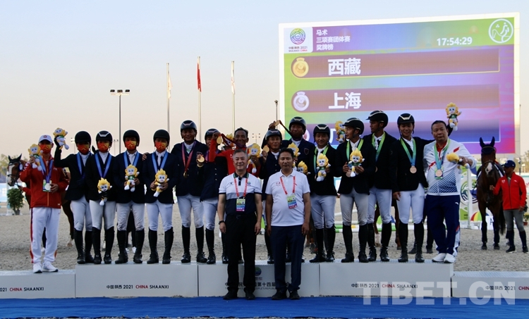 圖為西藏代表隊在馬術(shù)三項賽團體賽摘金后合影留念