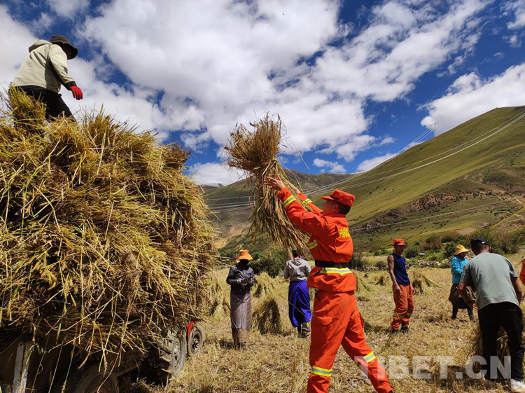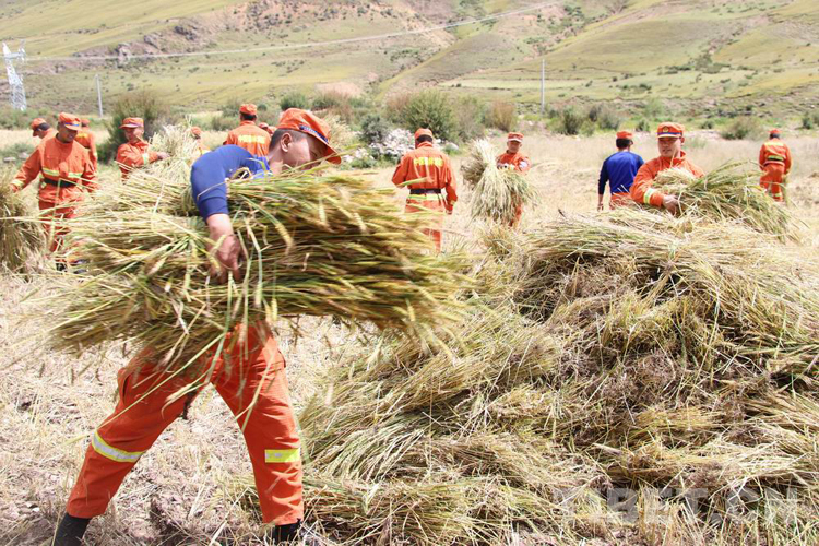 中國西藏網(wǎng)訊 農(nóng)諺說:“夏忙半個月,秋忙四十天?!鼻锸諏r(nóng)民來說至關重要,盼了一年的勞動成果,終于要歸倉了。近日,為了幫助西藏自治區(qū)昌都市左貢縣田妥鎮(zhèn)亞中村群眾及時收割地里熟透了的青稞,昌都市左貢縣森林消防中隊指戰(zhàn)員們放棄休息時間,走進田間,與鄉(xiāng)親們一起打響糧食搶收保衛(wèi)戰(zhàn),確保地里的青稞全部歸倉。