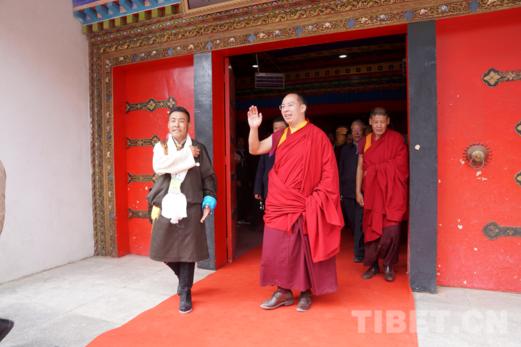 紀(jì)念館外,聞訊而來的信教群眾手捧哈達,迎候班禪并恭?!霸鞯吕铡薄0喽U在走進紀(jì)念館前后,揮手向群眾回以祝福。