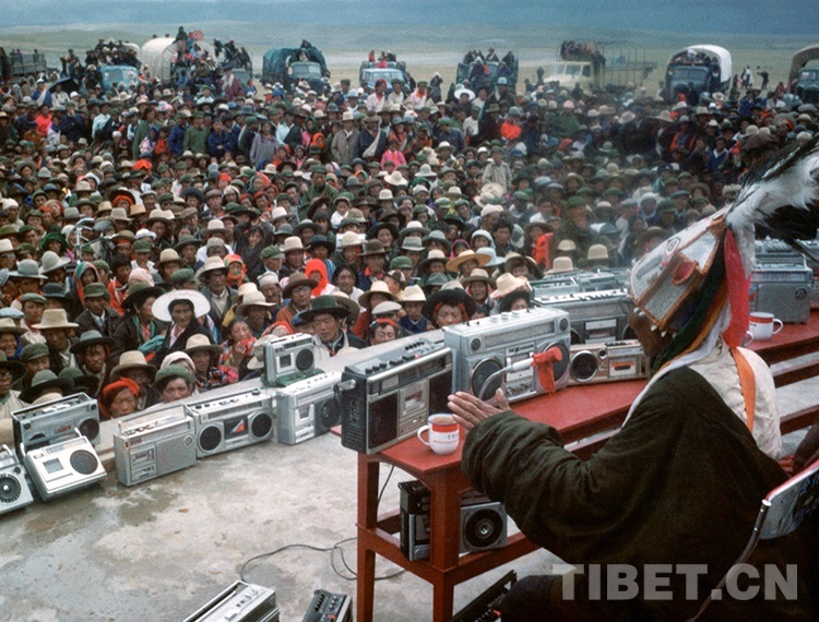 圖為說唱藝人阿達(dá)在西藏那曲賽馬會(huì)上說唱《格薩爾》的傳奇故事,臺上擺滿了牧民群眾的各式錄音機(jī)(才龍1985年前后攝)