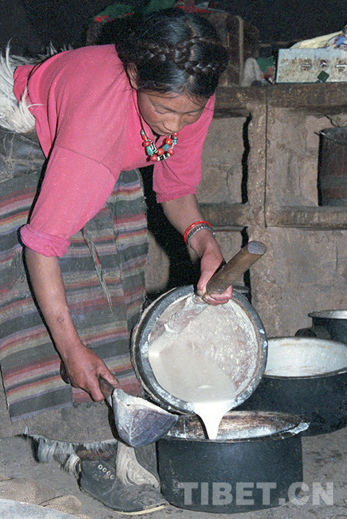 這是那曲地區(qū)(現(xiàn)那曲市)班戈縣牧女正在倒用木桶打過的牦牛奶,準(zhǔn)備熬制酥油(唐召明1987年攝)