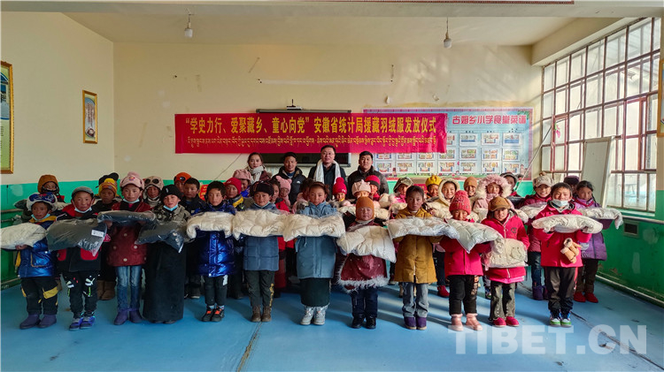 據(jù)了解,活動得到西藏自治區(qū)統(tǒng)計局、安徽省統(tǒng)計局、安徽省再貸款公司等單位企業(yè)以及愛心人士的積極響應(yīng),短短一個星期就購買到1013件羽絨服。為讓孩子們早日穿上羽絨服,援藏干部們決定立即將羽絨服送到古姆鄉(xiāng)小學(xué)。12月13日一早,他們一早就從拉薩出發(fā),日夜兼程,冒著零下二十多度的低溫大雪天氣,穿過十多個海拔5000米以上的埡口,行程1500多公里,終于在15日下午16點39分將羽絨服送到了孩子們手中,讓207名孩子在零下30多度寒冬中感受到了春天般的溫暖。
