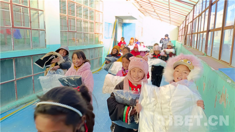 圖為向古姆鄉(xiāng)小學(xué)捐贈羽絨服