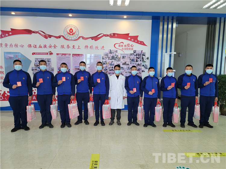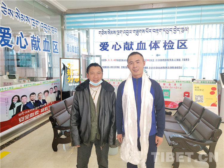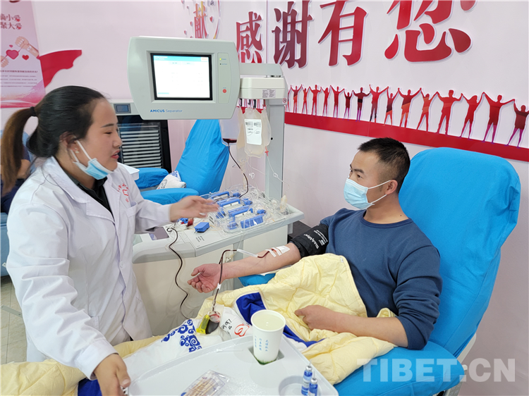 圖為那曲市森林消防大隊(duì)消防員張玉熙(右一)為那曲市人民醫(yī)院一名病人捐獻(xiàn)急需的B型血血小板