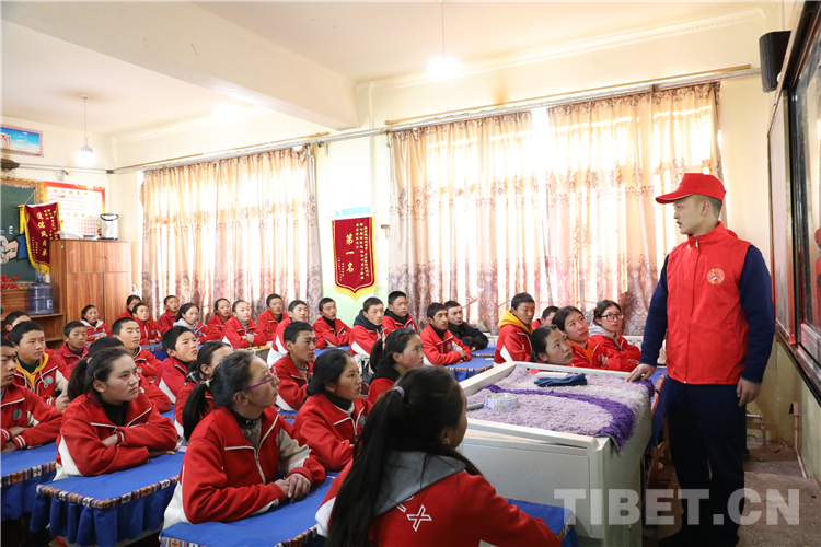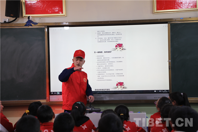 圖為那曲市森林消防大隊(duì)志愿者來到駐地附屬中學(xué)為師生們講解地震自救相關(guān)常識
