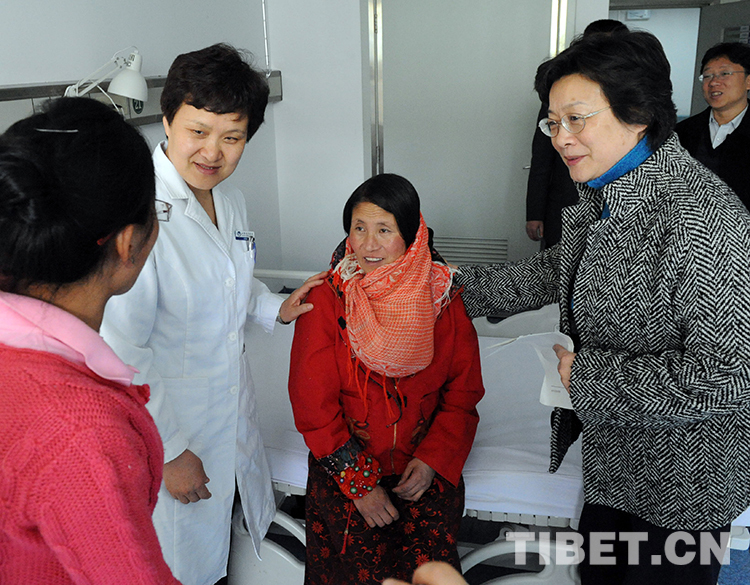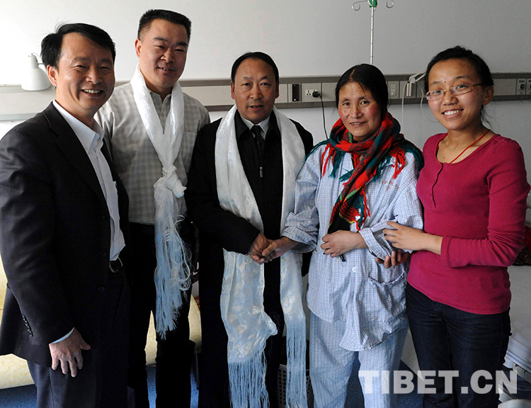 這是時任全國婦聯副主席甄硯(右一)受時任十一屆全國人大常委會副委員長陳至立委托,到北京口腔醫(yī)院看望斯求卓瑪,并送來慰問金(唐召明2010年4月14日攝)