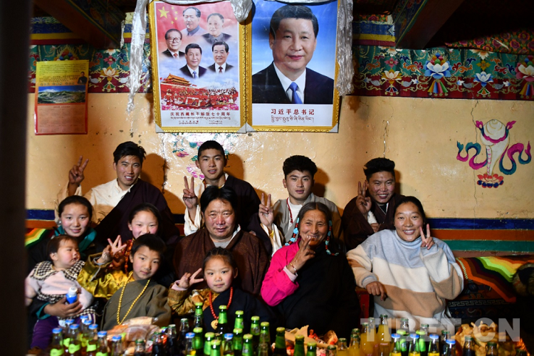 “尼瑪,拉姆,快過來獻哈達了!”索朗仁青一邊招呼著自己的孫子、孫女,一邊整理著手中的哈達?!跋蝾I袖獻哈達是我們家每年不變的傳統(tǒng),我們永遠感謝偉大領袖,感謝共產(chǎn)黨?!彼骼嗜是嘁患仪f嚴面向墻上懸掛的領袖像,高舉哈達,齊聲祝福:“扎西德勒!”