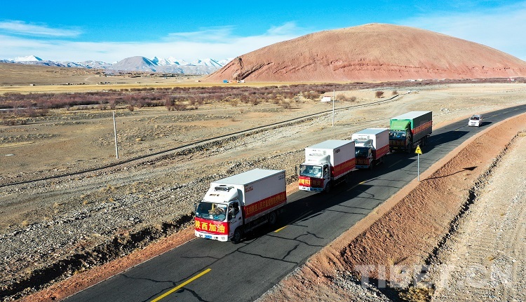 圖為運送阿里馳援陜西疫情防控保障物資的貨車從獅泉河出發(fā) 攝影:普索朗