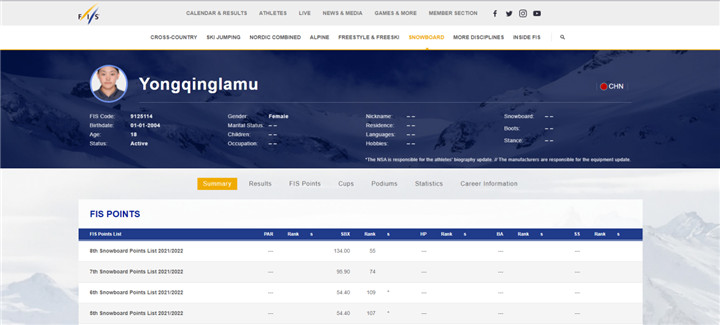 圖為國際雪聯(lián)官網(wǎng)運(yùn)動(dòng)員擁青拉姆介紹