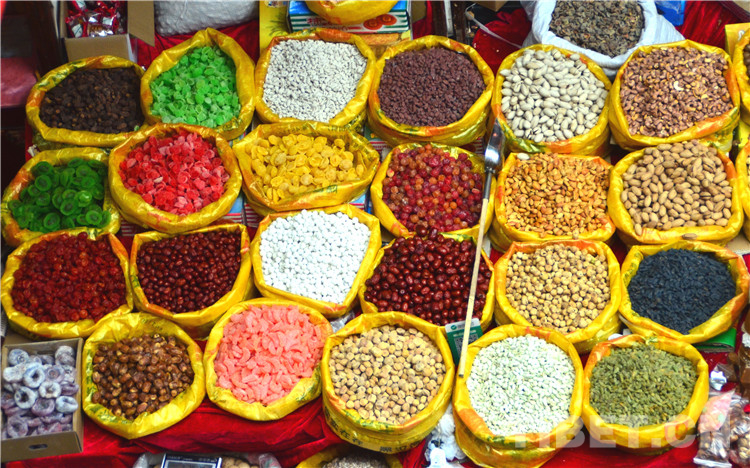 商城一層是一個年貨市場,一層一層壘起來的切瑪盒、不同顏色和形狀的卡塞、堆成寶塔形狀的紅糖、花盆里裝著的青稞苗……在那拿出皮尺量的,是在購買香布,藏歷新年到來時家家戶戶都會更換新的香布。