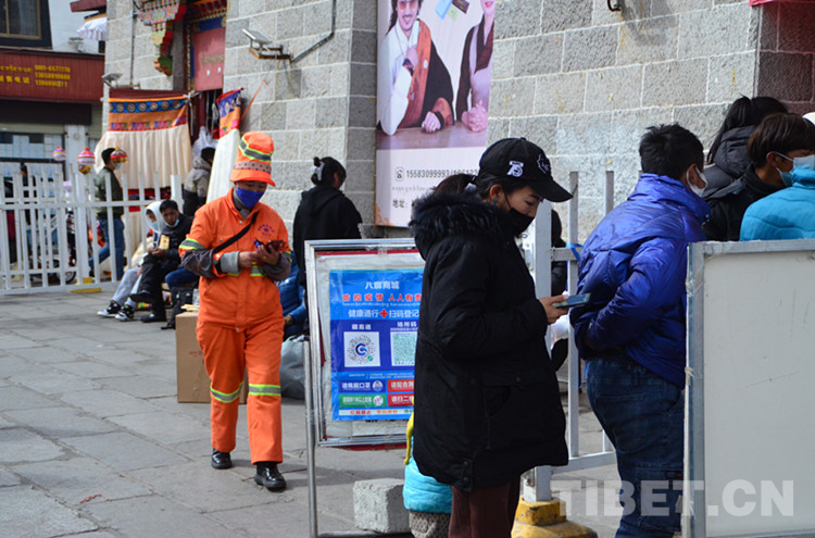 進(jìn)入八廓商城后,提示戴上口罩的廣播便一直在耳邊環(huán)繞。在進(jìn)入商城之前,還需要在入口處完成健康碼掃碼登記、測量體溫。