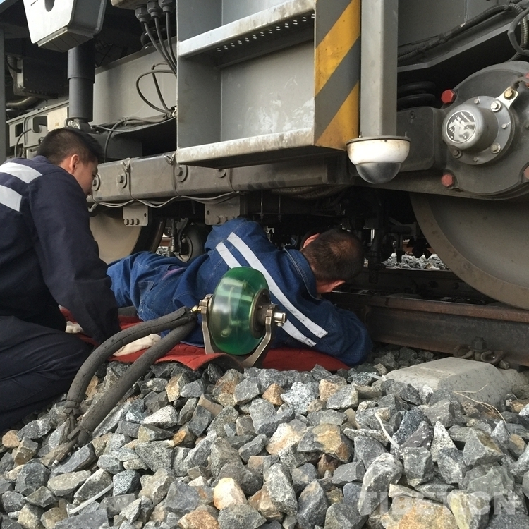 即將達(dá)到加查站時,探傷員余賢明發(fā)現(xiàn)探傷車左側(cè)第2個探輪有破損現(xiàn)象,需要更換探輪,大家立刻按照分工各就各位。隊長聯(lián)系集團公司調(diào)度、加查站安排探傷車??寇囌?,設(shè)置好防護后,李生紅和余賢明立即鉆到車下拆卸破損探輪,崔成剛和李慧臣則準(zhǔn)備好新的探輪。四個人分工協(xié)作,在夜幕降臨之前將新的探輪安裝了上去。