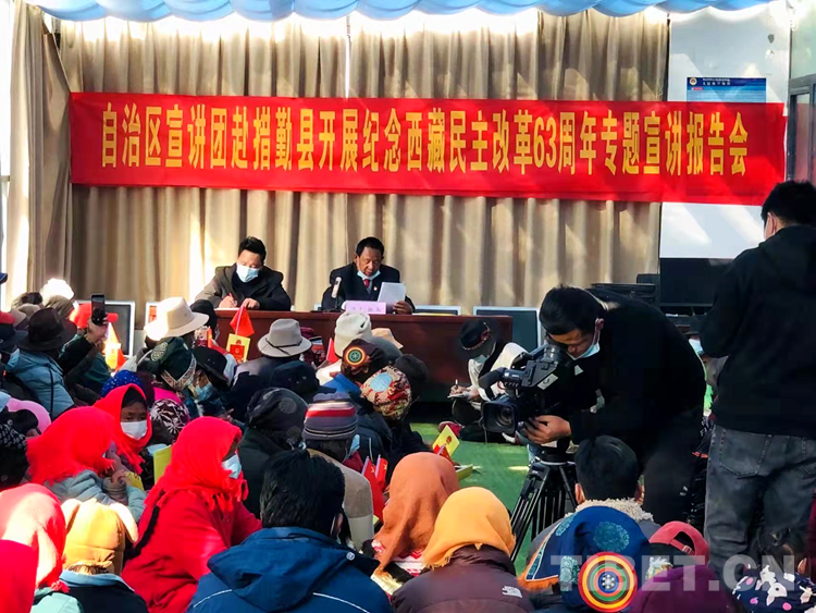 中國西藏網(wǎng)訊 3月26日,西藏自治區(qū)宣講團(tuán)在阿里地區(qū)措勤縣扎日南木措社區(qū)黨群活動中心開展紀(jì)念西藏民主改革63周年專項宣講。扎日南木措社區(qū)黨群活動中心約200多名群眾參加。