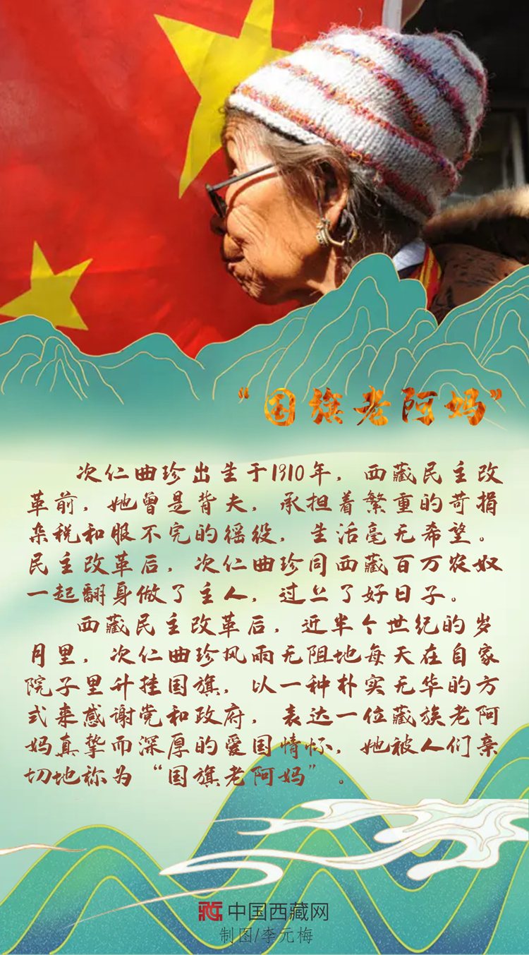 西藏民主改革后,次仁曲珍在自家院子里升起國旗,這一升就是近半個世紀,一天不落,風(fēng)雨無阻。只有經(jīng)歷過舊西藏的人才知道新西藏的可貴,翻身成為國家主人的“國旗老阿媽”,以上萬天堅持不渝的行動表達著自己樸素的愛國情懷。
