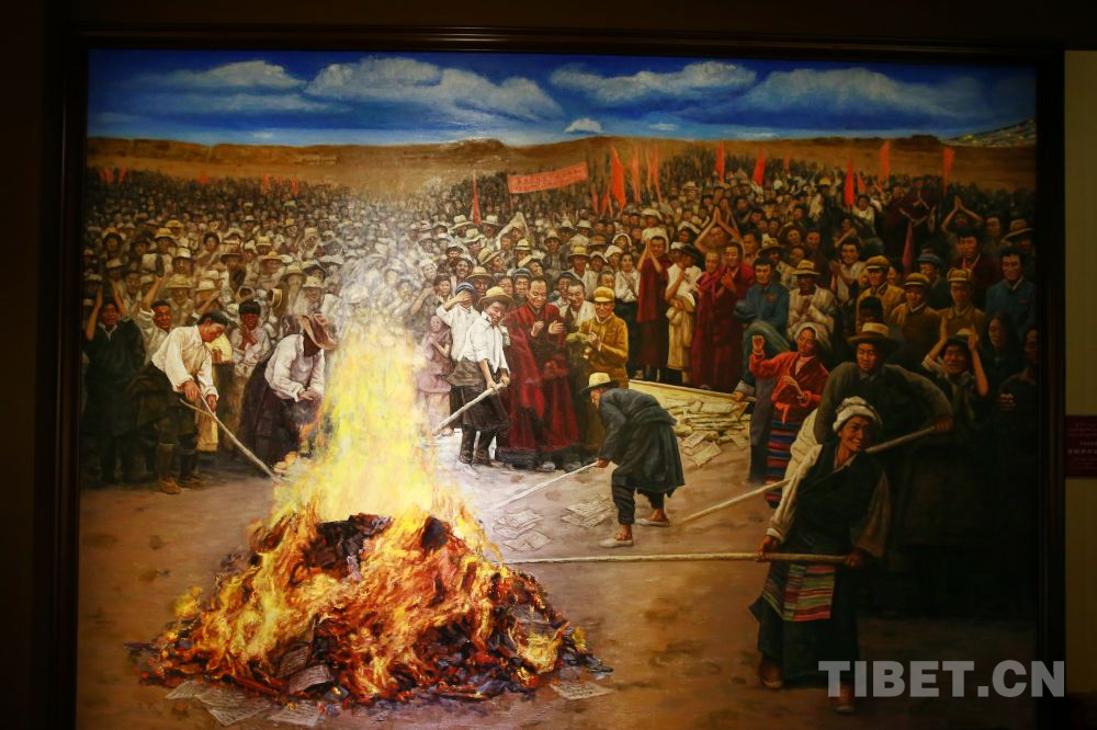 1959年3月,西藏開始實施民主改革,圖為達孜縣翻身農(nóng)奴正在焚燒契約和債券文書 翻拍:許娜
