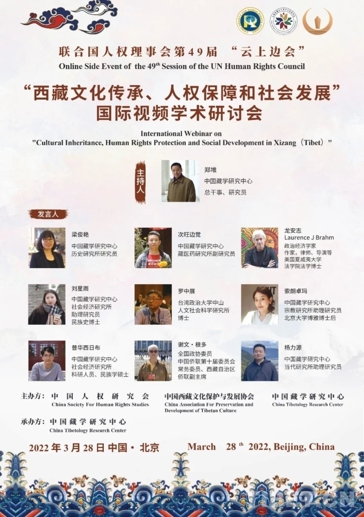 中國西藏網(wǎng)訊 3月28日,聯(lián)合國人權(quán)理事會(huì)第49屆“云上邊會(huì)”“西藏文化傳承、人權(quán)保障和社會(huì)發(fā)展”國際視頻學(xué)術(shù)研討會(huì)在北京舉行,國內(nèi)外有關(guān)專家學(xué)者40余人以線上線下相結(jié)合的方式參加了研討。