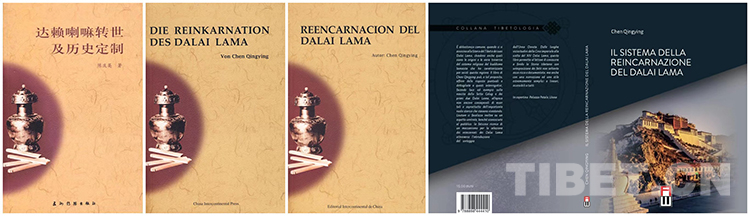 圖片分別為陳慶英著《達賴?yán)镛D(zhuǎn)世及歷史定制》漢文版、德文版、英文版封面和意大利文版封面封底