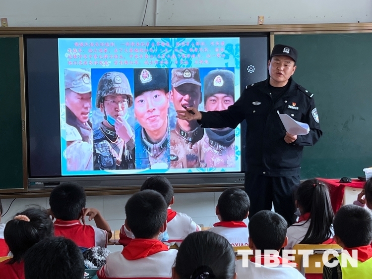 中國西藏網(wǎng)訊 “同學(xué)們,大家知道照片上這位英雄是誰嗎?”伴隨著民警周升展的提問聲,孩子們紛紛舉起手回答出了這位英雄——祁團(tuán)長。“你們真聰明,今天叔叔給大家講一講新時代衛(wèi)國戍邊英雄祁發(fā)寶團(tuán)長的故事……”