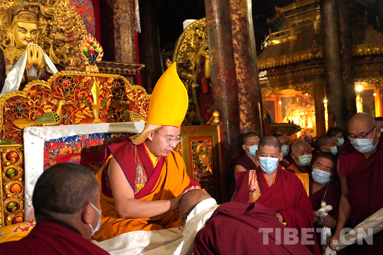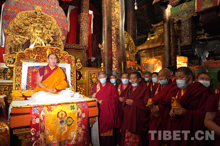 位于大殿東側(cè)正中的主殿,供奉有唐代文成公主帶入雪域高原的釋迦牟尼十二歲等身佛像。班禪入內(nèi),虔誠(chéng)而莊重地向佛像叩頭朝拜、敬獻(xiàn)哈達(dá)。隨后登上法座,在領(lǐng)經(jīng)師的伴誦下帶領(lǐng)眾僧誦經(jīng),祈愿國(guó)泰民安、世界和平、風(fēng)調(diào)雨順、人類(lèi)遠(yuǎn)離疫情、消災(zāi)祛難。集體誦經(jīng)結(jié)束后,班禪為大昭寺眾僧摸頂賜福并發(fā)放布施。