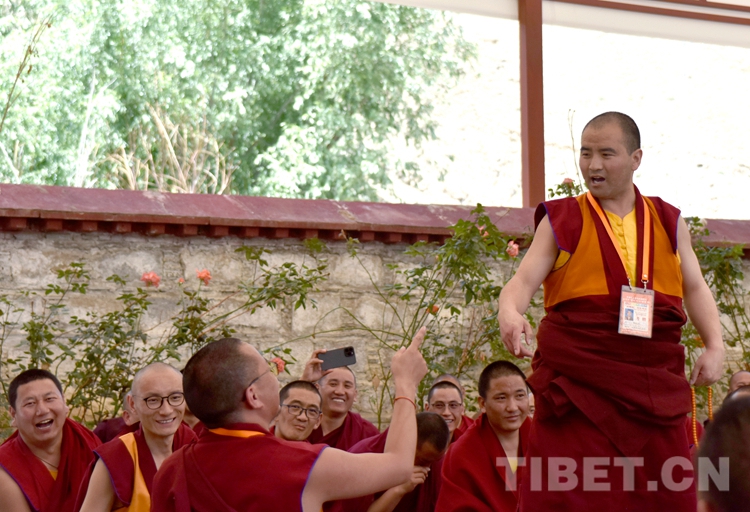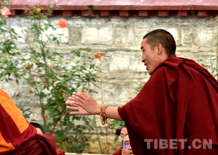 中國(guó)西藏網(wǎng)訊 身穿絳紅色袈裟,坐者仔細(xì)聆聽(tīng)、站立者臂套念珠、迸出佛學(xué)妙語(yǔ);圍觀者不時(shí)大笑……這是6月21日下午記者在西藏佛學(xué)院辯經(jīng)場(chǎng)看到的“唇槍舌戰(zhàn)”。