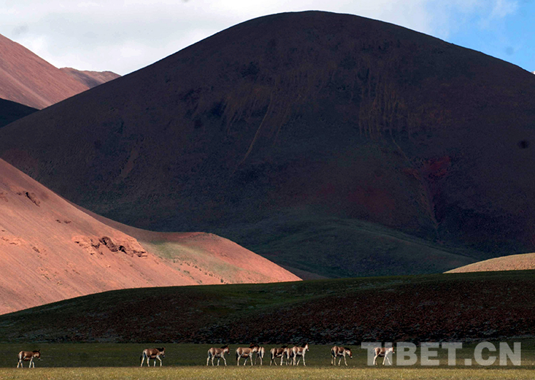 這是羌塘國(guó)家級(jí)自然保護(hù)區(qū)多彩的山脈與藏野驢(唐召明2009年8月5日攝)