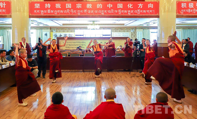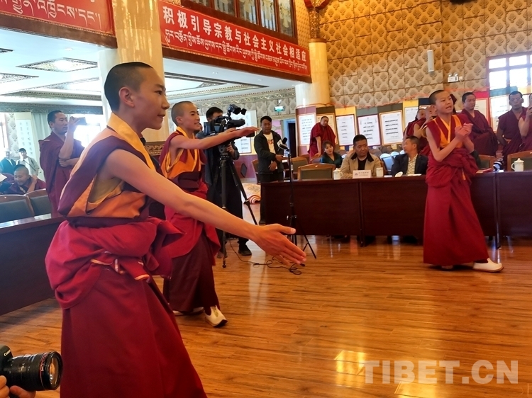 據(jù)了解,與傳統(tǒng)寺廟教育相比,西藏佛學(xué)院開設(shè)有文化課和佛學(xué)兩大體系,天資聰慧的少年活佛們?cè)谛F陂g已經(jīng)開始研習(xí)含義深刻、博大精深的《五部大論》《入菩薩行論》等佛教經(jīng)典作品,目前已經(jīng)可以流暢地背誦部分經(jīng)典。在當(dāng)日的學(xué)習(xí)成果匯報(bào)展示會(huì)上,少年活佛們不僅展示了藏漢雙語朗誦、藏漢文書法、英語情景劇等,也為大家?guī)砹恕度肫兴_行論》第一章的背誦展示和辯經(jīng)展示。