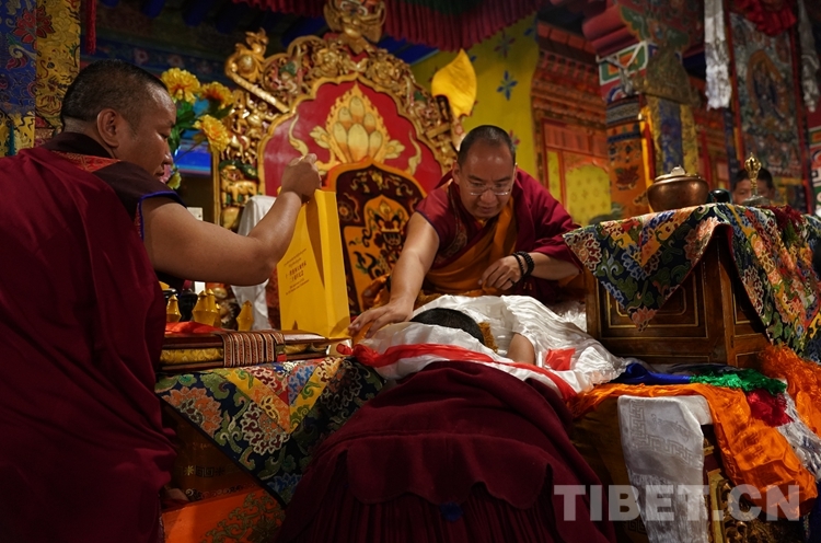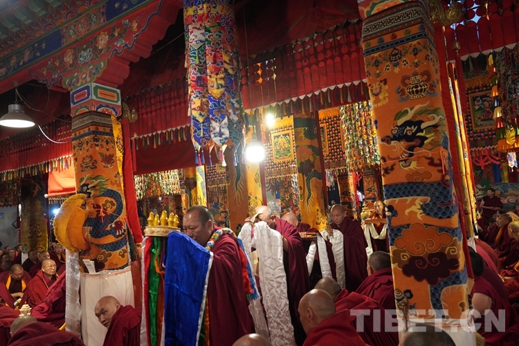 法號齊鳴、法鑼合奏,眾僧以隆重的宗教儀軌迎接班禪。班禪抵達藏傳佛教格魯派祖寺甘丹寺后在僧眾的簇擁下,先后步入羊堅多康殿、宗喀巴大師靈塔殿、十八羅漢殿朝拜、誦經(jīng)、敬獻哈達。