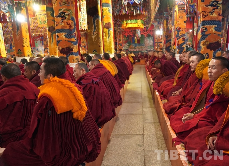 朝拜結束后,班禪步入甘丹寺夏孜扎倉,現(xiàn)場觀摩2023年度西藏自治區(qū)藏傳佛教學經(jīng)僧人晉升格西拉讓巴學位夏季預考活動。