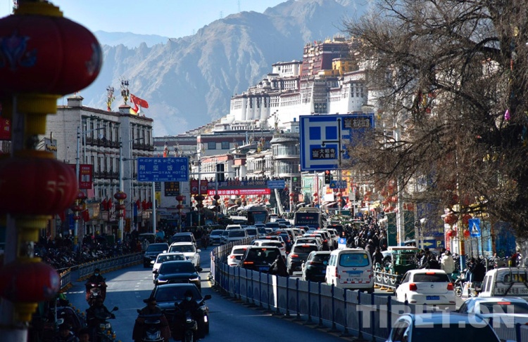圖為前往拉薩古城八廓街區(qū)沿途風光