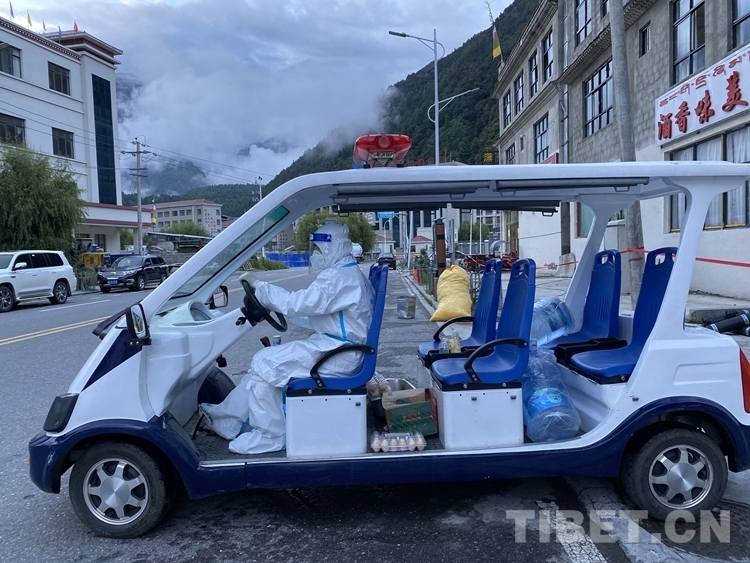 圖為西藏吉隆出入境邊防檢查站移民管理警察向隔離群眾運送生活物資 攝影:肖富貴