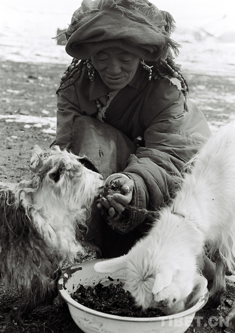 這是巴青縣一位牧女在雪災(zāi)中為饑餓的幼畜進行補飼,以減輕自然災(zāi)害所造成的損失(唐召明1990年攝)