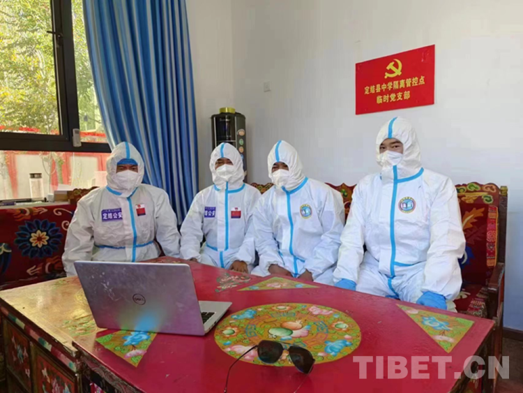 圖為10月16日上午,西藏自治區(qū)日喀則市定結(jié)縣中學(xué)隔離管控點(diǎn)一線“戰(zhàn)”疫工作人員收看黨的二十大開幕會(huì)直播